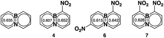 The B–N bond length is usually used as a measure of the relative stability of BN aromatics. Table 2 shows that the introduction of nitro groups to BNN does not significantly change the B–N bond length. When a nitro group is attached to BNN at position-1 (to 4), the B–N bond length is lengthened slightly by 0.011 Å, from 1.461 to 1.472 Å. With a further introduction of a second nitro group to position-8 (to 7), the length of the B–N bond is not lengthened but slightly shortened, changing from 1.472 to 1.460 Å. However, when the second nitro group is introduced to 4 at position-6 (to 6), the B–N bond length falls between the B–N bond lengths of 4 and 7 at 1.469 Å (Table 1). To look closely at how the bond lengths of nitro-BNNs impact the molecular aromaticity, we introduced the HOMA index [41,42] by using bond lengths collected from the X-ray crystallographic analysis. The results are depictured in Figure 2.