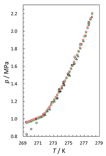 Table 2 lists and Figure 2 plots the p–T data for the three-phase equilibrium (ice/water + hydrate + vapor) for the 12CO2–H2O and 13CO2–H2O systems. The phase in the equilibrium of each point in Table 2 was determined using the quadruple point of the 12CO2–H2O system (1.04 MPa and 271.6 K) reported by [23]. To ensure the accuracy of the experimental apparatus described in the previous section, we evaluated the equilibrium p–T data of 12CO2 hydrates. From Figure 2, they correlate well with the literature [23,24,25,26]. The equilibrium pressures in the 13CO2–H2O system are higher by 0.007–0.012 MPa compared with the corresponding values in the 12CO2–H2O system between 269 K and 278 K. However, these differences are within the range of uncertainty of the pressure measurements.