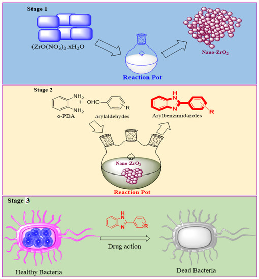 Synthesis of nano-ZrO2 catalyst (Stage 1) and aryl benzimidazoles (3, Stage 2) and antibacterial and antifungal activities (Stage 3).