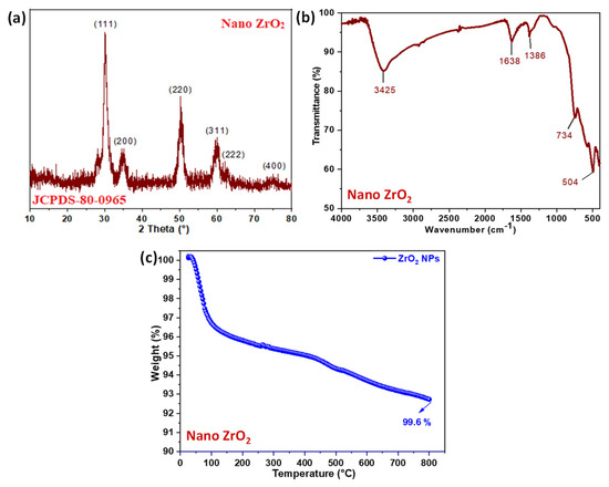 (a) XRD, (b) FT-IR, and (c) TGA of nano-ZrO2.