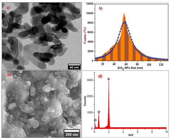 The morphology, size, and shape of the as-synthesized nano-ZrO2 were investigated by using HR-TEM. The TEM image of nano-ZrO2 showed stretched spherical particles with diameters of ~40–60 nm. Nano-ZrO2 has been well known for several years as having a variety of sizes and shapes, however, stretched spherical nano-ZrO2, as shown in Figure 3a, is rarely found. The corresponding size distribution histogram of nano-ZrO2 is shown in Figure 3b, and the calculated average particle size was about 60 nm, using ImageJ software. Further, the surface morphology of nano-ZrO2 was confirmed using SEM analysis, as shown in Figure 3c. The SEM image clearly showed that nano-ZrO2 appeared as aggregated spherical surface morphologies. The agglomeration of nano-ZrO2 is visible in the SEM images as well. Next, the elemental composition of nano-ZrO2 was analyzed by EDX [30]. The host material of nano-ZrO2 exhibited three elemental peaks which correspond to zirconium and oxygen at 0.1, 1.98, and 0.56 keV, respectively. From the EDS data, the weight ratio of Zr:O was approximately 77:23 and the spectra suggested that the nano-ZrO2 consisted of only Zr and O elements [38].