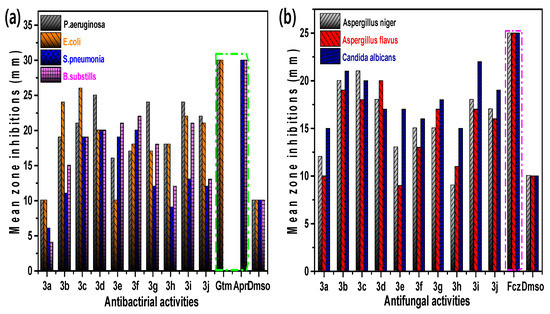 Figure 4a shows that the cup–plate screening method is simple for measuring inhibition of microorganisms. Here, we have used this method for the antibacterial screening of the tested compounds. Nutrient agar 2%, peptone 1%, beef extract 1%, sodium chloride 0.5%, and distilled water up to 100 mL were used in culture media. All the constituents were weighed and added to the base medium water. The solution mixture was heated in a water bath for about 1.5 h until a clear solution was obtained and the nutrient medium was sterilized in an autoclave. Antibacterial activity was assessed against Gram-positive bacteria (Streptococcus pneumonia (RCMB 010010), Bacillus subtilis (RCMB 010067)) and Gram-negative bacteria (Pseudomonas aeruginosa (RCMB 010046), Escherichia coli (RCMB 010052)). Ampicillin was used as a standard in the assessment of antibacterial activity against Gram-positive bacteria and gentamicin was used as a standard in the assessment of the activity of the compounds tested against Gram-negative bacteria. The results were expressed as the mean inhibition zone in mm ± standard deviation beyond the well diameter (6 mm) produced by microorganisms using 10 mg/mL of samples tested, as shown in Table 5.
