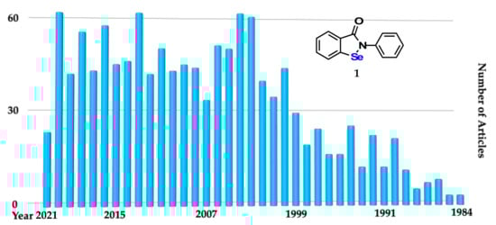 Since 1984, the research focused on ebselen spread incredibly with more that 1000 papers exponentially published. In Figure 1, a chart reports the number of articles plotted with respect to years. It was drawn by searching the term “ebselen” in PubMed.