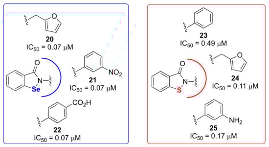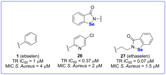 Some Gram-positive bacteria, such as Staphylococcus aureus, Bacillus anthracis, Clostridium difficile, Enterococcus faecium and Enterococcus faecalis, are pathogenic microorganisms able to cause serious diseases upon infection. B. anthracis causes anthrax, which is associated with a very high mortality rate, and it is perfectly shaped from a bioterrorist point of view. Notably, problems with methicillin-resistant (MRSA) and multidrug-resistant (MDRSA) S. aureus are becoming more and more common; thus the development of new antibacterial agents endowed with a mechanism of action different from that of the clinically used drugs is an urgent need. The thioredoxin system was selected as a target by Holmgren and coworkers in their drug discovery campaign meant to discover agents capable of inhibiting the growth of B. anthracis and/or MRSA. Thirteen derivatives were prepared, among them the 4-chloro-pyridin-2-yl-containing compound 26 and the dimer ethaselen 27 are worth mentioning (Figure 3). They displayed a higher potency in inhibiting thioredoxin reductase (TR) when compared to ebselen and showed a potent MIC against both S. aureus and B. anthracis [68].