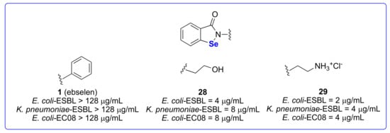 The increasing occurrence of MDR Gram-negative bacteria has become a tremendous health threat worldwide. Klebsiella pneumoniae, Pseudomonas aeruginosa, Acinetobacter baumannii and Escherichia coli are just a selection of what the WHO defines as “priority pathogens” [77]. The main difference between Gram-positive and Gram-negative bacteria is that the latter have two cellular membranes, with the outer one being impermeable to most small molecules. This natural barrier poses a tremendous challenge to the medicinal chemistry community that tries to develop broad-spectrum antibacterial agents [78]. Among the strategies to allow a better penetration into the periplasm, the increment of the hydrophilicity is among the most pursued. With this in mind, Yang and Chen prepared a series of ebselen analogues bearing aliphatic and polar functionality at the amidic nitrogen (representative compounds 28 and 29, Figure 4) [79].