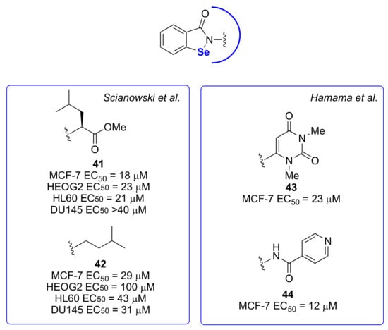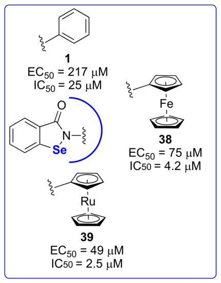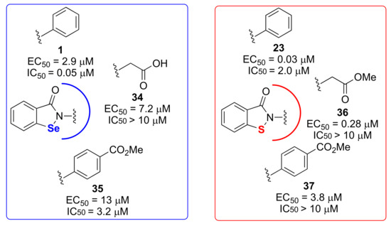 African sleeping sickness, caused by the eukaryotic pathogen Trypanosoma brucei, is a serious problem, particularly in sub-Saharan Africa, with no apparent solution since the available treatments are largely ineffective or poorly tolerated [100]. Both Ebselen and its sulfur analogue, ebsulfur (compound 23), were reported to exert anti-T. brucei activity by inhibiting its hexokinase 1 (TbHK1), which is a pivotal enzyme for the pathogen energy production chain [101]. Recently, the benzoisoselenazole and thiazole scaffolds were studied through the synthesis of analogues, then assayed for the inhibition of TbHK1 activity and T. brucei growth. The most interesting compounds are reported in Figure 8. Interestingly, the removal of the N-phenyl ring abolishes the anti-TbHK1 activity (compound 34 and 36). Nevertheless, such compounds still have the ability to inhibit the trypanosome cellular growth with micromolar potencies [102].