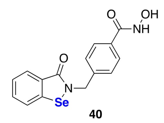 Compounds 28 and 29, being way more hydrophilic than ebselen, readily accumulated into the Gram-negative pathogenic bacteria, most probably by passing through the porins and exerted a powerful bactericidal activity with potency in the low micromolar range [79]. The K. pneumonia tested in this study expresses the so-called New Delhi metallo-β-lactamase (NDM-1), a kind of metallo-β-lactamases capable of destroying β-lactam-containing antibiotics by attacking the carbonyl group of the β-lactam through a zinc-bound hydroxyl ion. Such an enzyme was the target of a drug discovery process very recently carried out by Chan et al., who employed the benzisoselenazolone and its sulfur analogue benzisothiazole cores as templates for the synthesis of potent NDM-1 blockers [80,81,82].