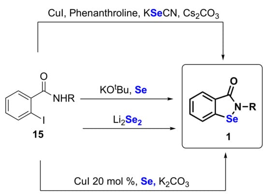 Ortho-iodo-benzamides 15 were used as starting material for a number of approaches summarized in Scheme 3. A copper catalyzed approach was reported in 2010 by Kumar and coworkers, who used elemental selenium as selenium sources through what it is thought to be a double selenium insertion, the first one into the copper nitrogen complex and the second in the carbon iodide bond [36,37] (Table 1, Method 7). The same authors later investigated the potassium tert-butoxide-promoted direct organication of elemental selenium [38] (Table 1, Method 8). Stoichiometric amounts of copper iodide were necessary for the construction of the ebselen core in the study published by Sucheck and coworkers, who employed potassium selenocyanate as a selenium source. Interestingly the reaction works well under thermal and photo activation; in the latter case, phenanthroline is not required [39] (Table 1, Method 9). Lithium diselenide in polar solvents is the selenium source in the protocol invented by Scianowski for the construction of diversely N-alkyl, N-aryl functionalized derivatives [40,41] (Table 1, Method 10).