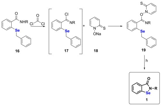 Schiesser published the sole approach based on radical chemistry. In particular, the benzyl selenide 16 obtained by treatment of 8 with benzylbromide (not shown), was initially converted into the corresponding iminyl chloride 17 by the reaction with phosgene. Compound 17 was not isolated but reacted with the sodium salt of N-hydroxypyridine-2-thione 18, leading to the pyridine-2-thioneoxycarbonyl imidate ester 19, which readily underwent photolysis and radical ring closing reaction to afford ebselen (Scheme 4) [42] (Table 1, Method 11). Recently, a review article by some of us gathered the synthetic efforts needed for the preparation of not just ebselen-like structures but also compounds bearing different Se-containing functionalities [43].