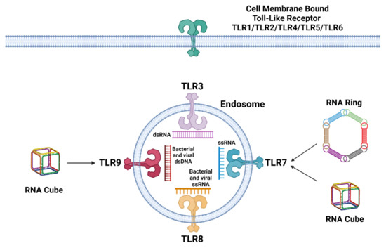 - Chandler, M.; Johnson, M.; Panigaj, M.; Afonin, K. Innate immune responses triggered by nucleic acids inspire the design of immunomodulatory nucleic acid nanoparticles (NANPs). Curr. Opin. Biotechnol. 2020, 63, 8–15. [Google Scholar] [CrossRef] [PubMed]