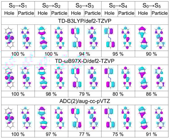 We first briefly discuss excited states of an azobenzene monomer. While the excited states of azobenzene were widely investigated before [48,49,50,51], we concentrate here on the performance of methods which will be used for dimers, and on the transition density matrix (TDM) analysis of the monomeric states. In particular, we will use linear response time-dependent density functional theory (TD-DFT) [36] with the B3LYP [52,53] and B97X-D [54] functionals, and algebraic diagramatic construction through second order (ADC(2)) [55,56,57]. The B3LYP is a global hybrid functional (with 20% of exact exchange) and the B97X-D is a long-range corrected functional. They are known to yield different excitation energies for azobenzenes (the TD-B3LYP energies are more red-shifted) and perform differently for charge transfer transitions [29,58,59]. The ADC(2) method is a post-Hartree–Fock wave function-based method, which was found to perform similarly to the approximate second-order coupled cluster (CC2) [60] for azobenzene in monomeric and dimeric forms (see supporting information in [61]).