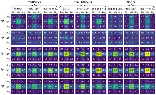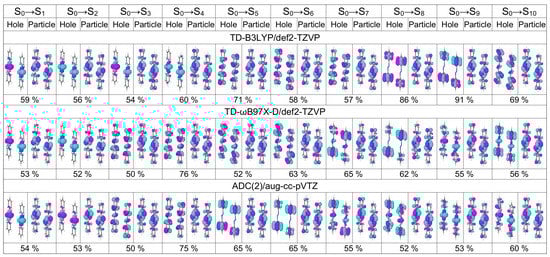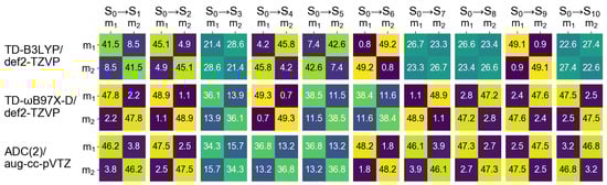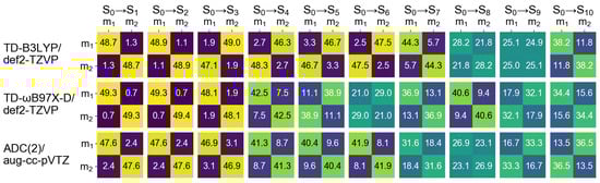 It is known that density functional approximations with a relatively low fraction of exact exchange, e.g., B3LYP, which includes 20% of exact exchange, promote CT excitations to a lower part of spectrum [67,68,69]. In our previous publication we observed it for a slightly asymmetric 4-nitroazobenzene dimer model (constructed using results of an optimizaton of a dimer attached to a silicon cluster), applying the NTO analysis [29]. However, for the symmetric model considered here, a visual inspection of NTOs cannot provide information about intrinsic composition of the electronic transitions, as mentioned above. Contrary to the NTOs, FTDM matrices are devised to answer the question of what types of excitations contribute to a transition. The matrices for the ten lowest transitions of the dimer Å are shown in Figure 6.
