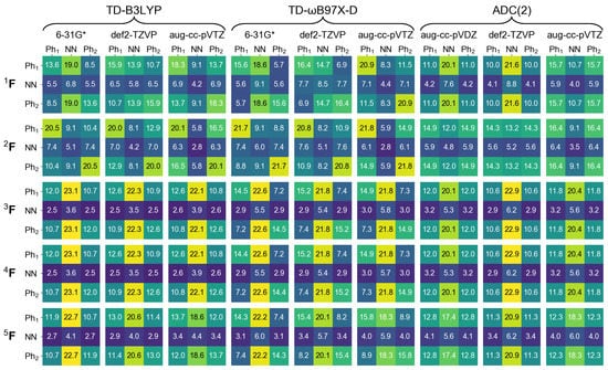 Further, the and matrices are almost identical to each other, and the matrix, while qualitatively being the same, is quantitatively different from and . In particular, the local NN contribution is smaller for than for and (by up to ∼24%, see the rightmost column of Figure 2). The matrices are qualitatively similar to the matrices only for TD-DFT calculations with 6-31G* and aug-cc-pVTZ basis sets, and the matrices differ considerably from the matrices.