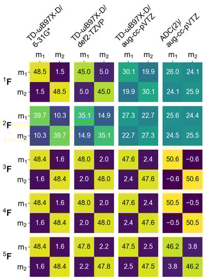 which represent the partitioning of (11) between fragments. Formulae (21) [31] and (22) [33] are similar to Mulliken population analysis. Formula (23) [45,46] is similar to Löwdin population analysis. Formulae similar to Equations (21)–(23) are used in the TheoDORE package [47]. We note that the sum of all FTDM elements, , is one for our definitions (19)–(23). Therefore, we will sometimes express the FTDM elements in %, i.e., as .