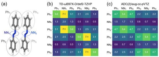 Further, if the CT contributions are non-negligible, as is the case for the transition, one may wonder from which part of one monomer to which part of the other monomer an electron is transferred. To answer this question, we partitioned the dimer into phenyl and azo fragments, similarly to what was done for the monomer. This partitioning is shown in Figure 8a. The corresponding 6 × 6 matrices calculated with TD-B97X-D/def2-TZVP and ADC(2)/aug-cc-pVTZ are presented in Figure 8b and c, respectively.