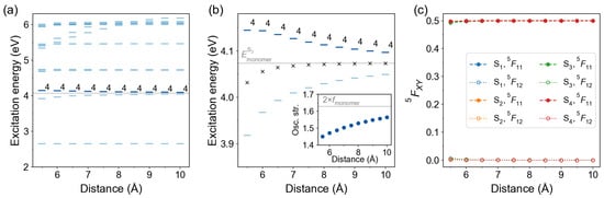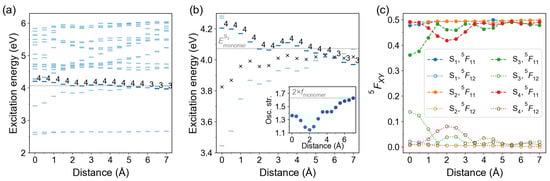 In Figure 9c we show the diagonal (1,1) and off-diagonal (1,2) elements of the 2×2 FTDM matrices for the lowest four transitions () as a function of distance d. We see that the transition possesses a non-negligible CT contribution at Å, which decays with distance and becomes virtually zero at Å. The state, on the contrary, is largely dominated by the local excitations for all considered distances except Å, at which the state has a different character and does not correspond to the monomeric state (see NTOs in Figure S1). The and transitions show appreciable CT contributions (>1%) only at Å and Å. The CT contributions are slightly larger than the ones.