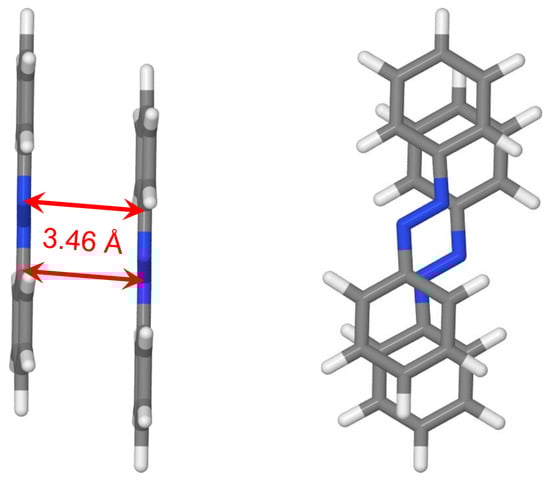 Finally, we optimized the geometry of azobenzene dimer starting from the cofacial -stacked dimer Å using B3LYP with Grimme’s D3 correction including the Becke–Johnson (BJ) damping function [71]. The optimized geometry is shown in Figure 12. It is seen that there are longitudinal and transverse shifts of one molecule with respect to the other one. The occurrence of these shifts is reminiscent to the case of the benzene dimer, for which the slip-stacked geometry is energetically favored [72]. The shortest intermolecular CN distances are about 3.46 Å. Moreover, the phenyl rings are slightly rotated around NC bonds with the corresponding NNCC dihedral angles being in the range 2–5.