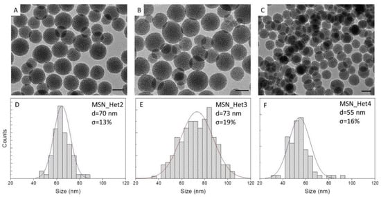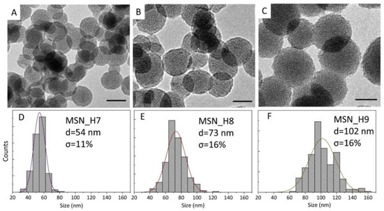 TEM micrographs ((A–C), scale bar 50 nm) and the corresponding size distribution statistical analysis (D–F) of MSN_H7 (A,D), MSN_H8 (B,E) and MSN_H9 (D,F).