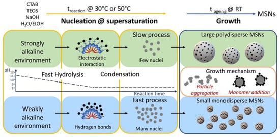 A reaction scheme has been depicted and reported in Figure 3 to account the size control of MSNs as a function of the alkaline environment condition. Indeed, pH influences the hydrolysis and condensation reaction [56]. Hydrolysis rate reaches its maximum at basic pH, while condensation rate at pH close to neutrality, decreasing at higher and lower pH [56]. Similarly, also MSN growth is affected by pH, by defining the particle surface potential. Therefore, by measuring the medium pH along the reaction it is possible to monitor the different steps of the synthesis, obtaining insights into the mechanism, and thus enabling a careful control of the MSNs’ size.