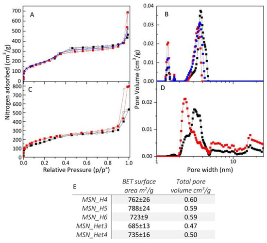 (A–C) N2 adsorption-desorption isotherms and (B,D) pore width distributions by NLDFT of MSN_H4 (panel A, B red line), MSN_H5 (panel A, B blue line), MSN_H6 (panel A, B black line), MSN_Het3 (panel C, D, black line), MSN_Het4 (panel C, D red line); (E) table of MSNs samples surface area and pore volume.