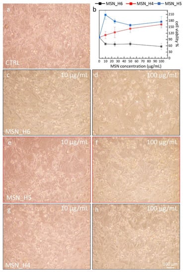 Cell viability has been evaluated by the MTT assay as function of MSN sample concentration, exploring a concentration range between 10–100 µg/mL. As shown in Figure 6b and Figure 7b, the cell viability of the bEnd.3 has been minimally affected upon their treatment for 24 h with MNS_H4 and MNS_H5. A slight dose-dependent decrease in the cell viability has been observed at the same extent for samples MSN_H6 and MSN_Het3 and MSN_Het4. This result can be accounted for by silanol groups, that in these samples are present in a high density, and can play a positive cytotoxic effect, inducing intracellular ROS formation responsible of cell oxidative damage. However, even at the highest tested concentration, 100 µg/mL, MSN_H6 and MSN_Het3 and MSN_Het4 cell viability above 50% has been always observed, indicating a poor cytotoxicity of the MSNs.