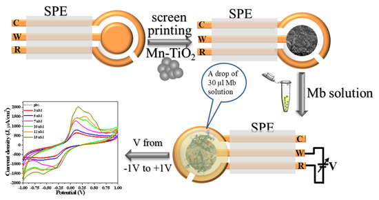 The reported methods for detecting Mb include optical fluorescence method [14], surface plasmon resonance method [15], mass spectroscopy [16], liquid chromatography [17], colorimetric method [18], molecular imprinting [19,20], immunoassay [21,22], chemiluminescence method [23] and electrochemical method [24,25]. However, the high cost of fabrication due to the use of expensive antibodies and noble metals such as Au, Ag or Pt limits its application. To overcome the problem, electrochemical based techniques can be the better alternative approach to estimate Mb content utilizing the presence of an electroactive heme center. We proposed a strategy for the sensing of Mb through electrochemical method using modified electrodes by Mn doped titanium oxide nanoparticles. Titanium nanoparticles were chosen owing to its biocompatible nature, as it is extensively used for biotechnological applications. Cyclic voltammetry and EIS was used to quantify the concentration of myoglobin in solution. The detection method was found to be faster (~10 ms) cheaper and easy to fabricate.