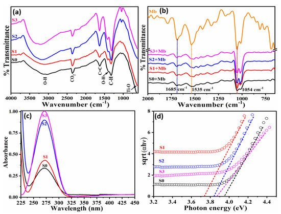 Typical FTIR spectra for the (a) as-synthesized materials and (b) materials interactions with Mb, (c) UV-Vis absorption spectra and (d) Tauc’s plot of undoped and Mn doped TiO2 nanoparticles [S0 = pristine Mn (13 × 1017 Mn atoms/cm3); S2 = TiO2 − Mn (20 × 1017 Mn atoms/cm3); S3 = TiO2 − Mn (32 × 1017 Mn atoms/cm3)].