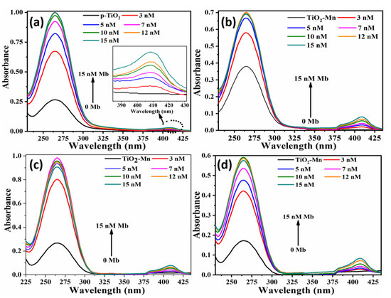 Figure 4a–d show the UV-absorption spectra for all, pristine (S0) and Mn doped TiO2 (S1–S3) obtained from the solution of as-synthesized nanoparticles with varying Mb concentrations from 3 nM–15 nM Mb. For measurements, 2 mL solution of nanoparticles (50 µg/2 mL) was prepared at pH 7.4 in which the proper volume of Mb solution was consequently added to attain the required Mb concentration. The absorption intensity and full width at half of maxima (FWHM) increases with increasing Mb concentrations, which indicates interaction between myoglobin molecules and TiO2 nanoparticles. The increase of intensity is due to the increased number of chromophores. Increase of FWHM versus Mb concentration implies the increase of oxidation attributed to the Fe oxidation with increasing Mb. Mb absorption showed a characteristic peak at 409 nm owing to heme which linearly increased with increasing concentration. UV-Vis results indicate the conjugation of Mb with nanoparticles [31].
