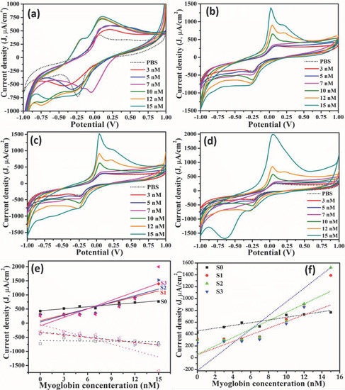 The cyclic voltammogram for Mn doped TiO2 nanoparticles at different concentration of Mb is shown in Figure 5a–d, demonstrating the increase in oxidation peak current and decrease of reduction peak current for all fabricated sensors based on pristine and Mn doped TiO2 nanoparticles. The oxidation/reduction peak potential found at 0.18 V and -0.42 V, respectively, for pristine TiO2 implies the reversible reaction (Figure 5a). The oxidation and reduction peak potential were shifted towards the higher energy side with increasing Mb concentration, as the density of redox species increases at the electrode surface. For S1 samples (having 13 × 1017 atoms/cm3 of Mn), the oxidation and reduction peak potential was found at 0.1 V and −0.24 V, respectively, for 3 nM Mb (Figure 5b). Both the potentials are marginally shifted towards the low energy side (Figure 5b). However, for samples of TiO2 doped with 20 ×1017 atoms/cm3 of Mn (S2), they are found at 0.1 V and −0.24 V, respectively, with a slight shift in oxidation and reduction peak potential as seen in Figure 5c. For S3 samples, i.e., TiO2 doped with 32 × 1017 atoms/cm3, the oxidation and reduction peaks appeared at 0.08 V and −0.26 V, respectively, and are estimated from Figure 5d). The difference between oxidation and reduction in all cases are ≤0.60, suggesting the reversible nature of the reaction during sensing. However, the oxidation and reduction peak shifted towards low energy and the difference between redox peaks shrank for all samples at higher Mb concentrations. Additionally, the ratio of peak oxidation to reduction current is between 0.6 to 1.2 and is constant for repeated measurements, indicating the reaction reversibility. This behavior suggests that Mb conformation does not change and hence the sensor can be reused. The peak current density (J) was plotted against Mb concentration and treated as the calibration curve (Figure 5e) and the slope of the curve is estimated as the sensitivity of sensors, which is listed in Table 1. The increased sensitivity with doping concentration is correlated to the increased strain and density of states as reported earlier [32]. All the samples exhibited linear response in the characterized range, i.e., from 0–15 nM as evident from calibration curve (Figure 5e). In general, pristine (S0) and doped TiO2 (S1-S3), all show the low value of limit of detection (LOD) compared to that of reported values [33,34] with S3 exhibit the lowest LOD in comparison to all the studied samples (Table 2). The LOD for each sample was estimated from the ratio of standard deviation to the slope of calibration curve, i.e., (3.3 × standard deviation)/(slope of calibration curve). The obtained LOD is lowest possible than previous reported values (Bulko et.al., 2010; Tai et.al., 2002; Tripathi et.al., Wang et.al., 2014; Wang et.al., 2017; Yang et.al., 2017; Yue et.al., 2011). The error bar is shown in Figure 5f which shows the high degree of repeatability of the measurement indicating the repeatability of the device.
