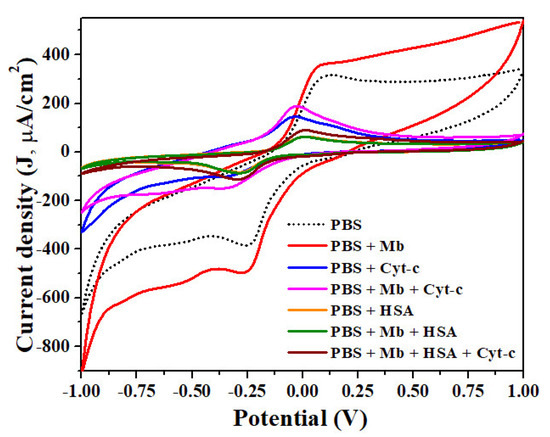 The interference study carried out with cyt-c and HSA, being a heme protein, is shown in Figure 6. It revealed different oxidation peak potentials for PBS, Mb, cyt-c and HSA as 0.1 V, 0.08 V, −0.04 V and 0.28 V, respectively. The peak oxidation and reduction potential for 1:1 mixture of cyt-c and Mb solution was −0.04 V and −0.36 V, respectively, and the redox peak potential for HAS and Mb in 1:1 ratio was +0.20 V and −0.28 V. The results imply that the developed sensors easily distinguish between two heme proteins as well as serum protein viz. cyto-c, HSA and Mb (Figure 6). The minimum peak current is observed for HAS even in the mixture of Mb + HSA (green curve) and Mb + cyt-c + HSA (wine curve). A slight increase in current density is observed when mixed with cyt-c and Mb in 1:1:1 ratio and is corelated to the presence of heme protein in the mixture. Additionally, Mb exhibited the maximum peak current density (red curve; Figure 6) reflecting the Mb detection selectivity of the developed sensors.