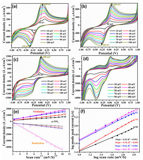Effect of scan rate on the CV characteristics obtained at 7 nM of Mb for electrode made of (a) S0: pristine TiO2 (b) S1; TiO2 with 13 × 1017 Mn atoms/cm3 (c) S2: TiO2 with 20 × 1017 Mn atoms/cm3 (d) S3: TiO2 with 32 × 1017 Mn atoms/cm3 (e) peak current (both oxidation and reduction) versus square root of scan rate, and (f) log of peak current (oxidation) versus log of scan rate show linear response.