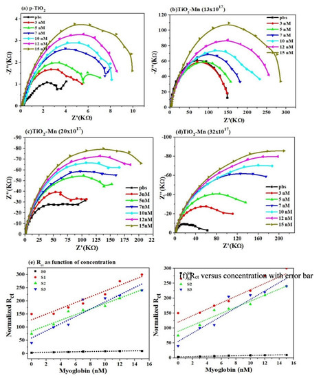 Series of Nyquist plots acquired for different Mb concentration for as synthesized TiO2 and Mn-doped TiO2 nanoparticles: (a) S0—pristine TiO2 (b) S1—TiO2-Mn (13 × 1017) (c) S2—TiO2-Mn (20 × 1017); (d) S3—TiO2-Mn (32 × 1017); (e) Rct values of Mb at 3–15 nM in PBS. (f) Error bar in Rct values estimated from three measured cycles.