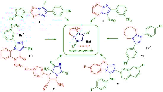 Imidazole and its derivatives are of special interest as pharmacologically attractive heterocycles in medicinal chemistry. These compounds exhibit a widespread spectrum of biological activities. It is important to note that their antimicrobial and antifungal activities are some of the priorities for this class of heterocycles [11]. On the other hand, the combination of the imidazole ring with other heterocyclic moieties in condensed heterocyclic systems is one of the successful directions in the design of new molecules with antibacterial and antifungal activity. Thus, compounds with these types of activity have been identified among imidazo[2,1-b]-1,3,4-thiadiazoles I [12], imidazo[1,2-a]pyrimidines II [13], imidazo[1,5-a]quinoxalines III [14], pyrrolo[1,2-c]imidazoles IV [15], imidazo[2,1-b] [1,3] benzothiazoles V [16], etc. (Figure 1). Moreover, earlier we established the antifungal activity of derivatives of 3-aryl-6,7-dihydro-5H-pyrrolo[1,2-a]imidazole derivatives, structurally related to heterocycles [17]. Thus, quaternary salt VI (3-biphenyl-4-yl-1-(4-ethylphenyl)-6,7,8,9-tetrahydro-5H-imidazo[1,2-a]azepin-1-ium bromide) showed a polyvalent activity to S. aureus, C. neoformans, and C. albicans approaching reference drugs in their activity [18]. Given the above arguments, the aim of this work was to design novel 5H-pyrrolo[1,2-a]imidazole and 5H-imidazo[1,2-a]azepine quaternary salts as potential antimicrobial agents (Figure 1).