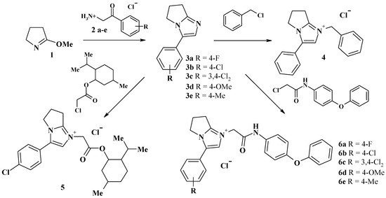 3.1.2. Synthesis of 3-Aryl-6,7-dihydro-5H-pyrrolo[1,2-a]imidazole Quaternary Salts (4, 5, 6a–e)