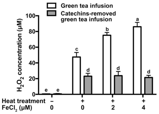 The degradation of catechins is coupled to the formation of H2O2 [9]. In a previous study, the concentrations of catechins in tea infusion were decreased and the concentrations of H2O2 were increased during storage [4]. A similar phenomenon was detected during heat treatment of tea infusion in this study (Figure 2). The addition of Fe2+ dose-dependently increased the levels of H2O2 in green tea infusion. In contrast, the levels of H2O2 in catechins-removed green tea infusion were not significantly elevated by the addition of Fe2+. It proved that H2O2 in heated green tea infusion was partially derived from catechins and Fe2+ promoted the generation of H2O2 dependently on catechins.
