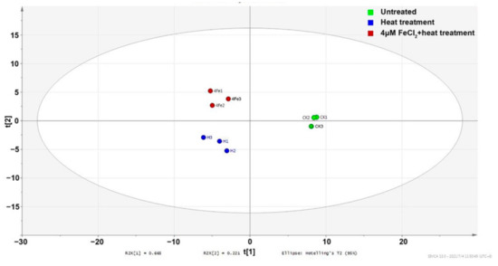 The volatile profiles of the three infusions were quite different. It was supported by the results of PCA. Points representing samples with different treatments in the PCA score plot were clearly separated (Figure 4). The types and relative abundance of alkenes, alcohols, and heterocycles were gradually increased in unheated tea infusion, heated tea infusion, and heated tea infusion with Fe2+ addition, respectively. Meanwhile the relative abundance of aldehydes, ketones, and esters were gradually decreased in the three infusions, respectively. When categorized by aroma characteristics, green/grassy volatiles were gradually decreased and woody volatiles were gradually increased in the three infusions, respectively.