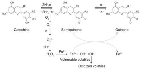 Green tea has been traditionally and widely used as a beverage in China. Ready-to-drink tea is preferable in modern society because of its convenience. Compared with freshly-brewed tea, the aroma of ready-to-drink tea is less fresh, sometimes even dull, impairing its sensory quality. The aroma of tea infusion deteriorates fast during heat sterilization [1,2]. Green tea infusion, which contains a higher level of unoxidized catechins (Figure 1), tends to experience more severe aroma deterioration than black tea and dark tea infusions during heat treatment [3]. Aroma deterioration is positively correlated to the degradation of unoxidized catechins and the accumulation of hydrogen peroxide (H2O2) [4], suggesting catechins might be vital in the aroma deterioration. Nevertheless, there are other factors.