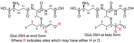 This work demonstrates, for the first time, that glut-3SH-al can undergo keto–enol tautomerism resulting in hydrogen–deuterium exchange occurring at the C-2 position of the hexanal moiety. The NMR data also provide evidence that the enol form is not a minor component of the system, as is typical for mono-carbonyl compounds [16], rather that the enol form accounts for approximately 60% of glut-3SH-al, estimated by the relative integrals of the peaks due to H-1 and H-1*.
