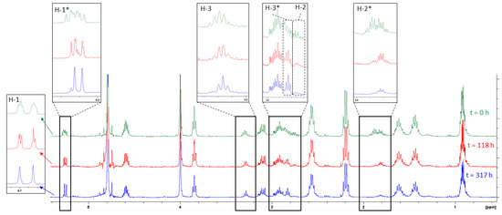 To characterise the compounds by NMR, both 1D and 2D experiments were carried out on a solution of glut-3SH-al in D2O (approx. 80 mg mL−1). Additionally, 1H NMR spectra were obtained at various intervals to assess the change in the spectra over time (see Figure 2). The peak due to H-1*, the proton bonded to C-1 of the enol form of glut-3SH-al identified in this work, can be seen in the 1H NMR spectra of glut-3SH-al reported by Muhl et al. [14], but is outside the range of the 1H NMR spectrum shown in Thibon et al. [12].