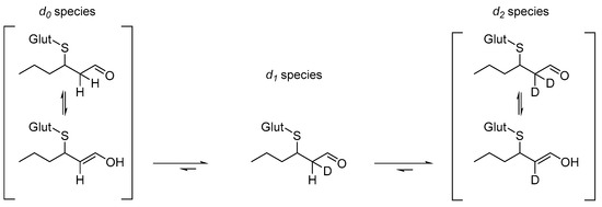 The incorporation of two deuterium atoms at the H-2 position was confirmed by HRMS analysis of the sample of glut-3SH-al in D2O used for NMR analysis. After the sample in D2O was stored for two weeks, the HRMS spectrum showed a major peak at m/z 430.1587, corresponding to the sodium ion adduct of glut-3SH-al-d2 (C16H25D2N3NaO7S) while the peak at m/z 429.16 corresponding to the sodium ion adduct of glut-3SH-al-d1 was less than ¼ of the height of the peak due to glut-3SH-al-d2. Additionally, the largest of the peaks due to [M + H]+ was at m/z 408 for glut-3SH-al-d2, with the peak at m/z 407 due to glut-3SH-al-d1 being approximately 25% of the height of the peak at 408, and the peak at m/z 406 due to glut-3SH-al being negligible. Thus, after storing glut-3SH-al for 14 days in D2O the major species is glut-3SH-al-d2, meaning enolization has proceeded significantly.