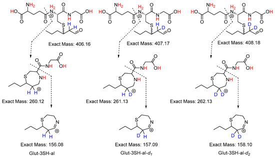 QqQ mass spectrum data were obtained using an Agilent 6400 Triple Quadrupole mass spectrometer (Santa Clara, CA, USA) system equipped with an Agilent (Santa Clara, CA, USA) jet stream electron spray ionisation probe. Nitrogen (BOC, Auckland, New Zealand) was used as the desolvation gas at 9 L/min at 200 °C, the nebuliser was set at 45 psi, and the sheath gas temperature is 350 °C at 11 L/min. The ESI capillary was set at 4000 V and the nozzle voltage at 500 V. The optimised fragmentation voltage for glut-3SH-al and the deuterated analogues was 100 V.