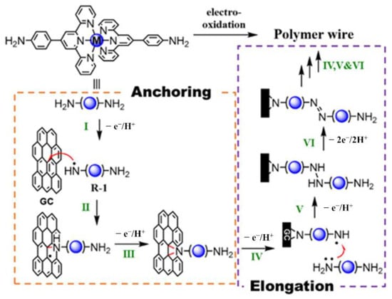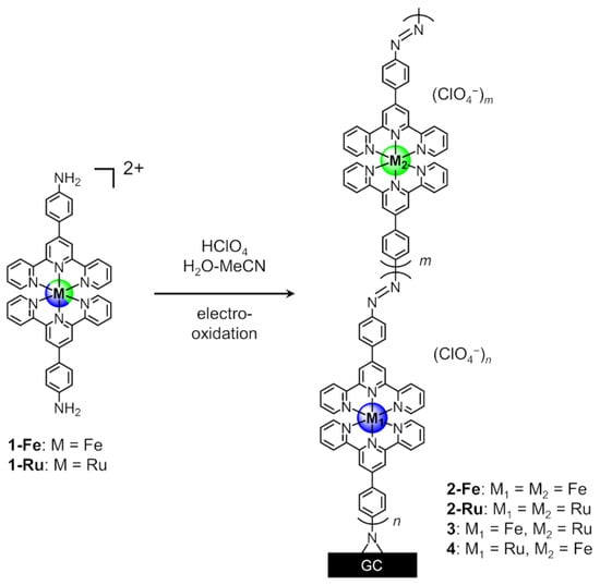 - Collin, J.P.; Jouaiti, A.; Sauvage, J.P. Anodic electropolymerization of films of polypyrrole functionalized with metal terpyridyl redox centres. J. Electroanal. Chem. 1990, 286, 75–87. [Google Scholar] [CrossRef]