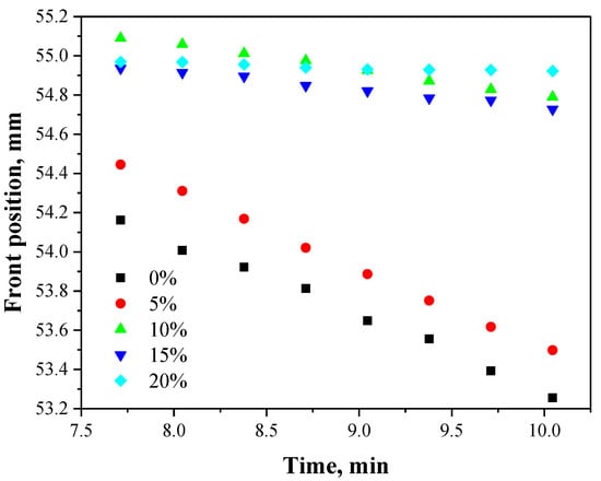 In order to select the adequate concentration of the PVP solution used for the synthesis of polymer–ceramic composites, the stability of the ceramic phase (HAp) in the polymer solutions at various concentrations was evaluated. Among the analyzed concentrations—i.e., 0%, 5%, 10%, 15%, 20% and 25%—the highest one was not considered for further syntheses due to the fact that such a solution was not homogeneous. In the case of the other concentrations, the stability evaluation by determining the migration front as a function of time was performed. The results obtained are shown in Figure 2.