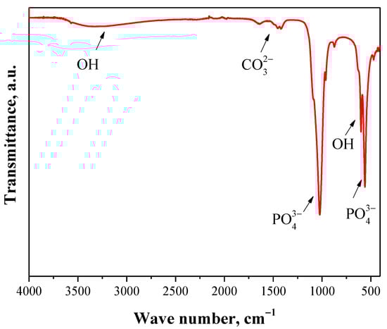 In Figure 4, FT-IR spectrum of prepared hydroxyapatite is shown. The wide absorption band of relatively low intensity within the range 3550 cm−1–2975 cm−1 observed on the FT-IR spectrum may be assigned to the valence vibrations of OH group [34]. Moreover, the absorption band visible at 620 cm−1 corresponds also to the hydroxyl group [34]. Next, the band at 1425 cm−1 indicates the presence of asymmetric stretching vibrations deriving from carbon ions [35]. At 1025 cm−1 and 560 cm−1 absorption bands corresponding to the phosphate groups—which are characteristic for hydroxyapatite—may also be noticed, wherein the first mentioned band may be attributed to the stretching vibrations of O-P-O bond, while the second one corresponds to the triply degenerated bending mode of -O-P-O present in the PO43− groups [36].