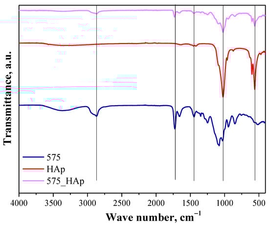 FT-IR spectrum of HAp (red), polymer matrix obtained using PEGDA 575 (575, blue) and the composite obtained using the same crosslinker (575_HAp; pink).