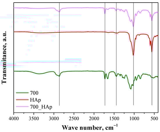 FT-IR spectrum of HAp (red), polymer matrix obtained using PEGDA 700 (700, green) and the composite obtained using the same crosslinker (700_HAp; pink).