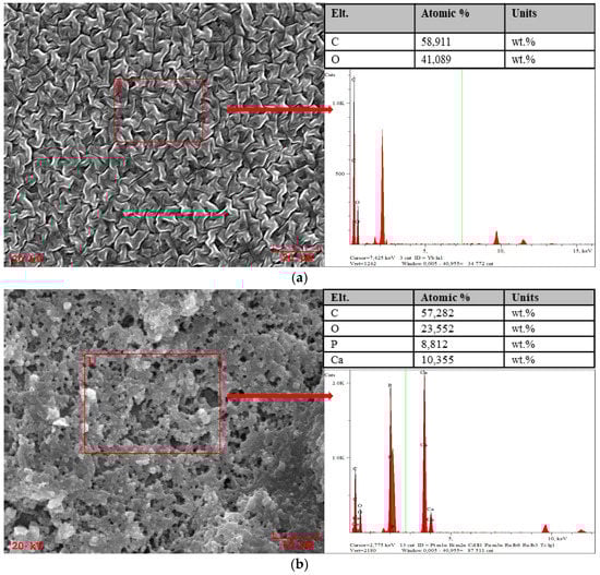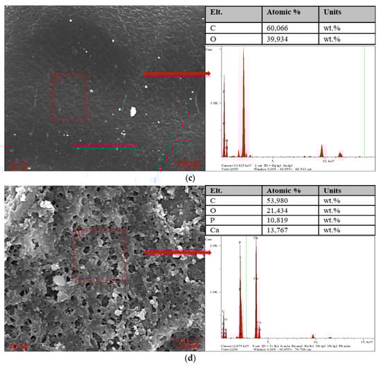 The surface morphology of both polymer matrices and polymer–ceramic composites was characterized via the SEM technique. The performed SEM analysis also included an elemental analysis. Obtained images and corresponding point elemental analyses are presented below in Figure 8.
