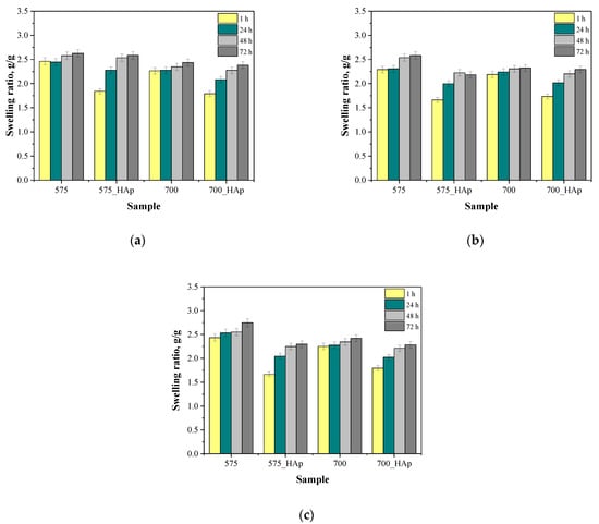 Additional differences may be observed in the case of samples containing ceramic phase. The swelling ratios of composites with hydroxyapatite were lower compared to analogous unmodified polymer matrices. This, in turn, may be related to the fact that the ceramic phase fills free spaces between polymer chains decreasing in such a way the volume of free spaces available for absorbed liquids.