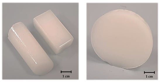 The proposed methodology allowed us to prepare composites having various shapes and sizes which constitutes their big advantage in viewpoint of their potential application for bone tissue regeneration. This is because it will be possible to adjust the adequate reaction vessel to obtain material suitable for specific bone cavity. Example images of obtained composite materials are presented in Figure 11.