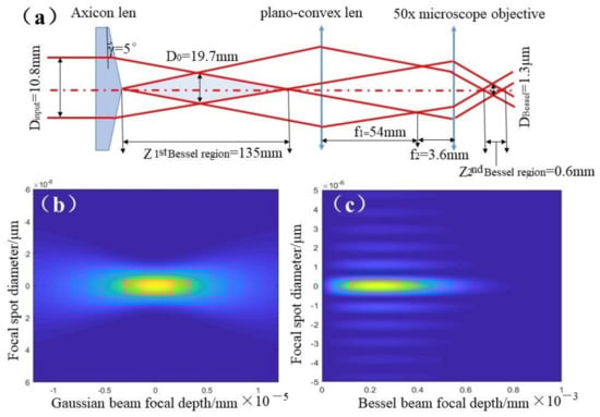 Optical system design and intensity distribution of Bessel laser beam. (a) The optical system design of Bessel Beam; (b) Laser intensity distribution of Gaussian Beam; (c) Laser intensity distribution of Bessel Beam.